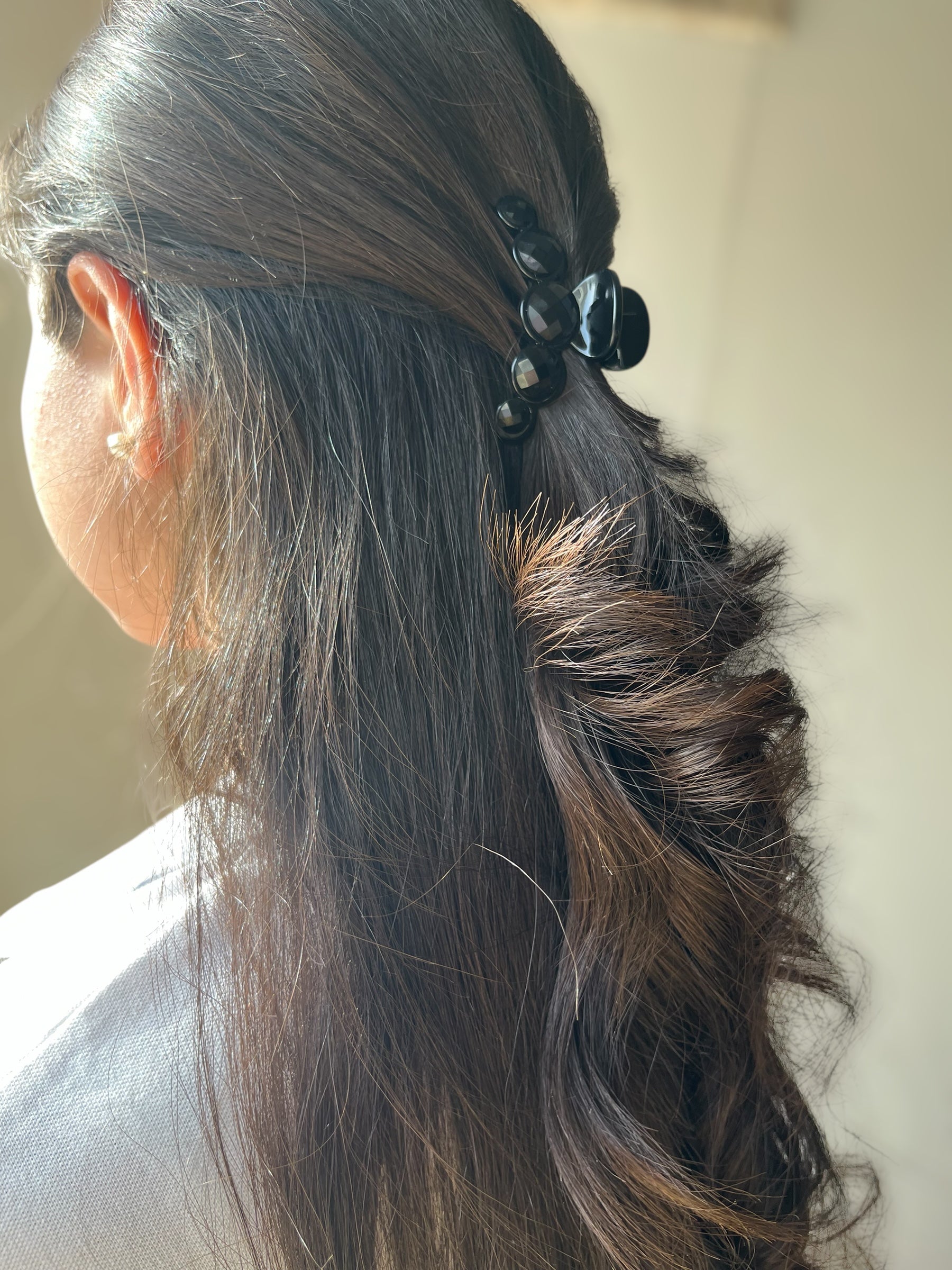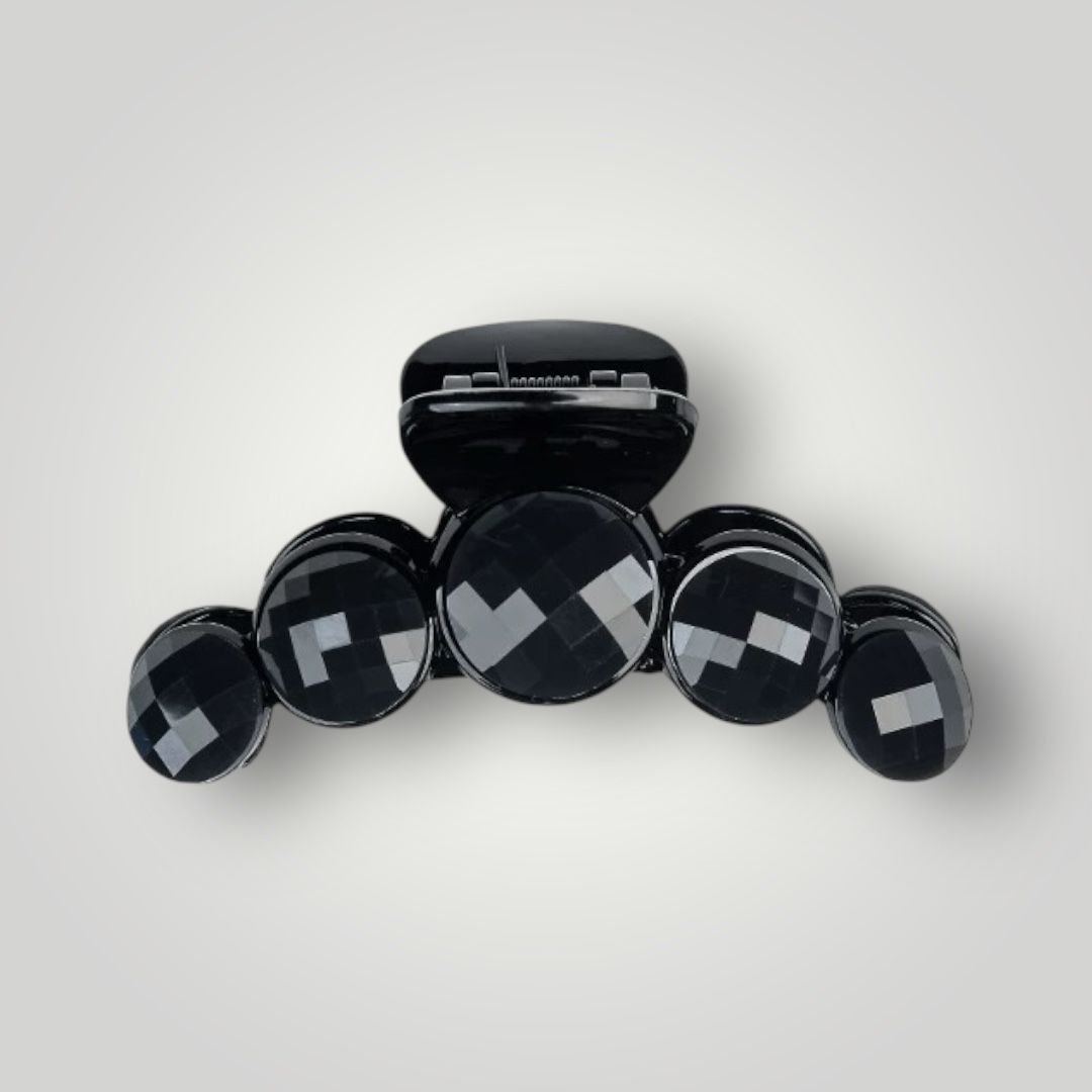 Elevate your everyday look with the Midnight Glam Hair Claw. Featuring glossy black facets set in a bold, circular design, this claw clip combines strong grip with sleek elegance. Perfect for effortlessly chic updos, whether you’re heading to brunch or a night out. Stylish. Sturdy. Stunning.