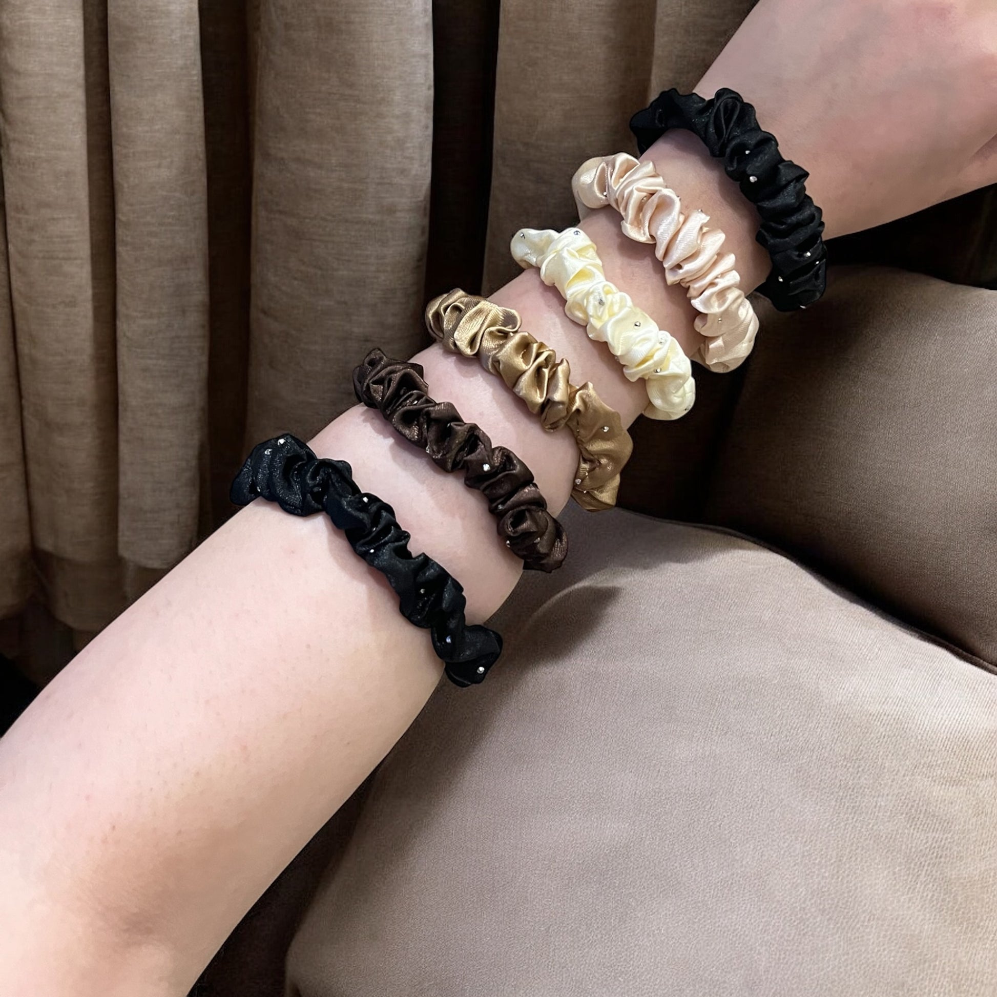 Add a touch of warm elegance to your ponytail with the Pearl Swirl Ties. This stylish hair tie features a soft, swirling fabric in rich caramel hues, beautifully adorned with lustrous faux pearls and delicate rhinestones for a subtle sparkle. Perfect for creating chic ponytails, effortless buns, or adding a refined accent to any hairstyle. This hair tie offers a comfortable and secure hold with a touch of understated glamour.