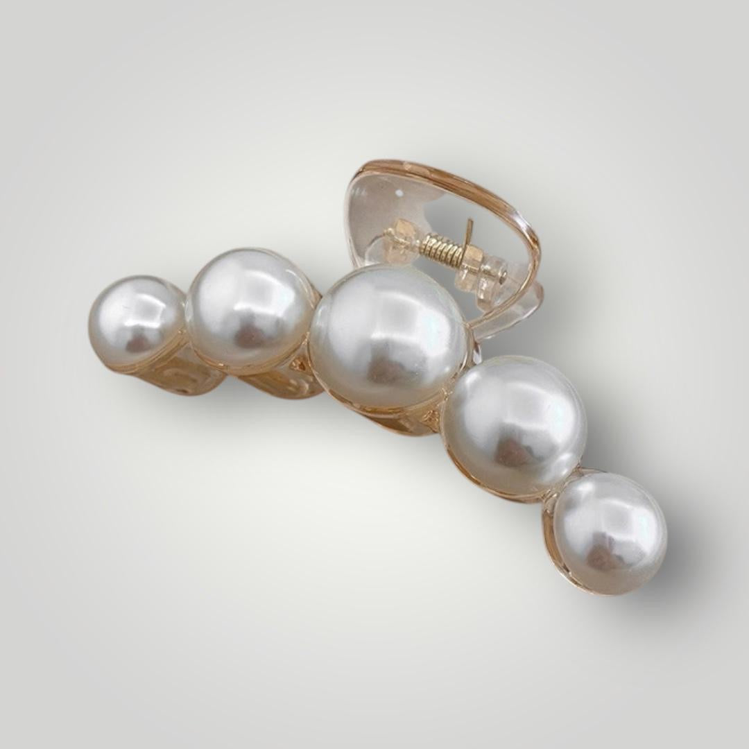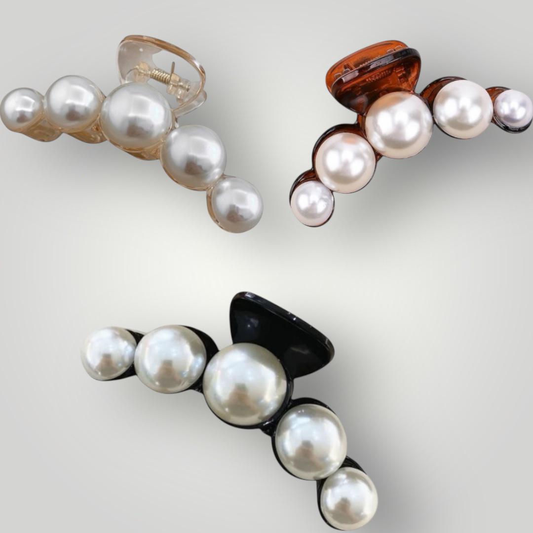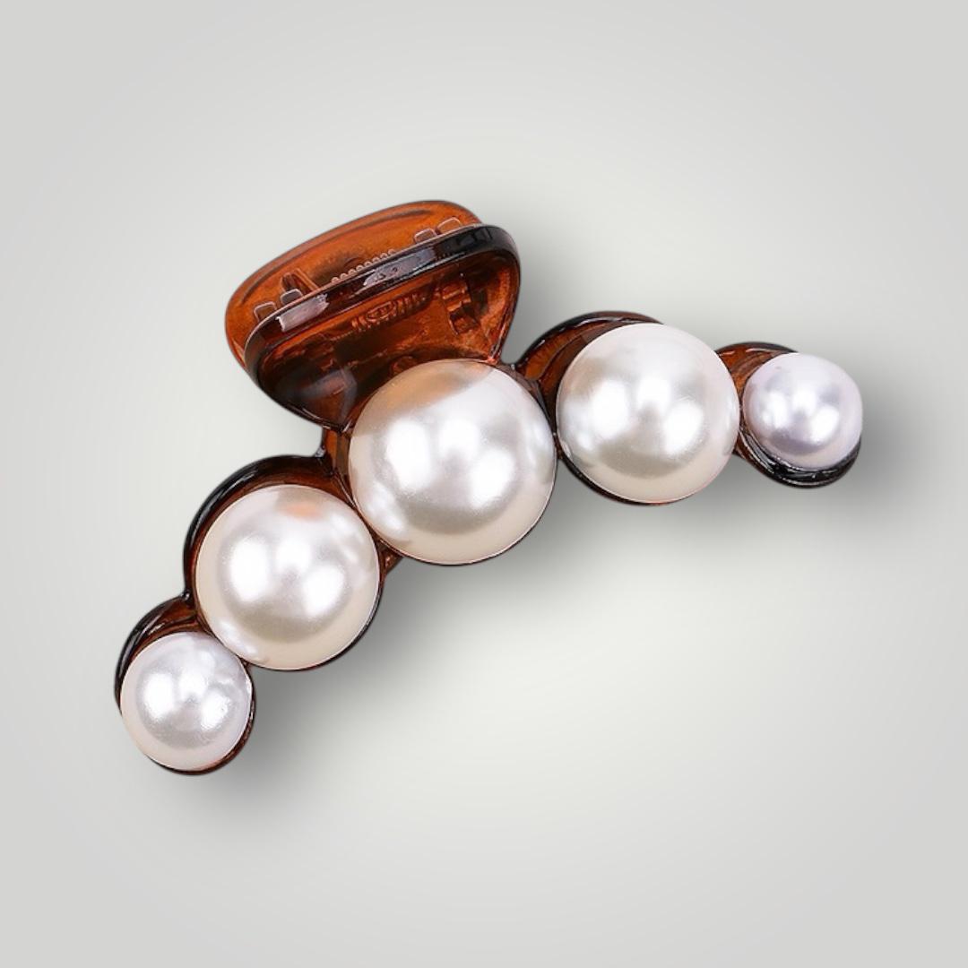 Elevate your hairstyle with our Regal Pearl Clip. This exquisite 7cm claw clip features a sleek clear, black and brown base adorned with five luminous, graduated pearls, exuding an aura of classic elegance. Perfect for creating sophisticated updos, securing a chic half-ponytail, or adding a touch of timeless radiance to any look.