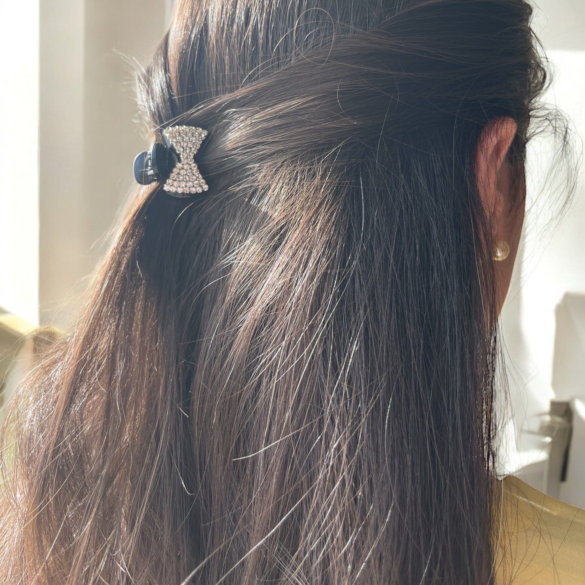 Add a touch of sparkle to your hairstyle with the elegant Stellar Sparkle Bow. Featuring a classic black design embellished with multiple rows of dazzling rhinestones, this sturdy claw clip provides a secure and comfortable hold for various hair types. Perfect for quickly sweeping up your hair while adding a touch of glamour to your everyday look or for special occasions. Durable and stylish, it's a must-have accessory for effortless chic.